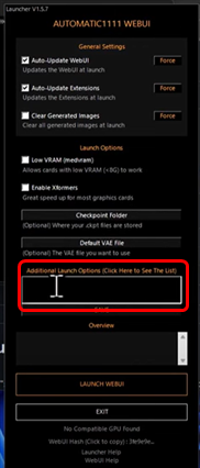「–use-cpu all –no-half –no-half-vae –skip-torch-cuda-test」