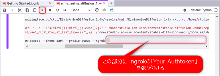 ノートブックが開いているので、一番下までスクロールし、–ngrokの後ろ部分